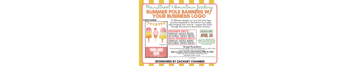 Sponsor a Downtown Zachary Pole Banner! 12 different designs w/ your full color logo proudly displayed on the bottom ⅓ of each sign hanging from June 1st - August 31st 2026, through downtown & Mainstreet Zachary.